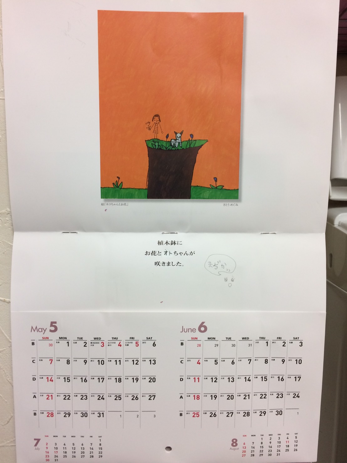 スタッフルームに掛けてあるカレンダーにほっこりする絵と詩が手直ししてある(^^)