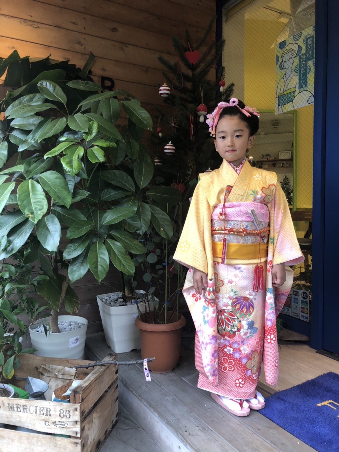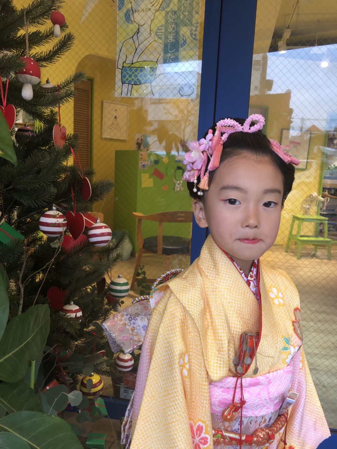 淡い色合いがとってもお似合い♡髪をセットして、お着物に着替えて、メイクして。 普段とは違うその姿にウキウキしてくれてました。7歳の女の子は一気に印象が変わりますね♪ わたしたちもウキウキです!